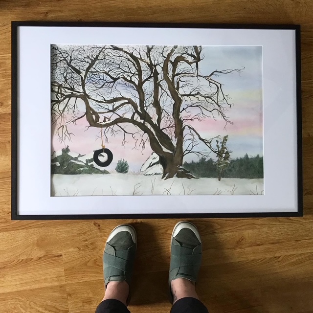 Winter image of a apple tree with tire swing pink sunset sky, and green foliage in the background, framed with artists feet.