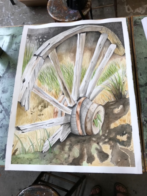 Group art project with Emma Curley and Maria Case, recreation of wagon wheel from textbook Water Color Pen and Ink by Claudia Nice.