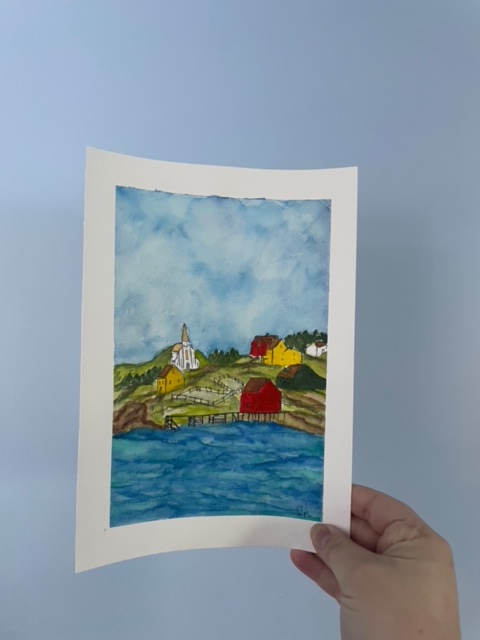 bright blue ocean foreground with a colourful shoreline of houses, a wharf, and church, with muted sky. Gifted to family.