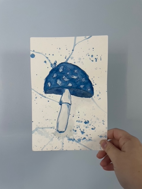 a blue mushroom with blue splatter and running lines. Gifted to friend.