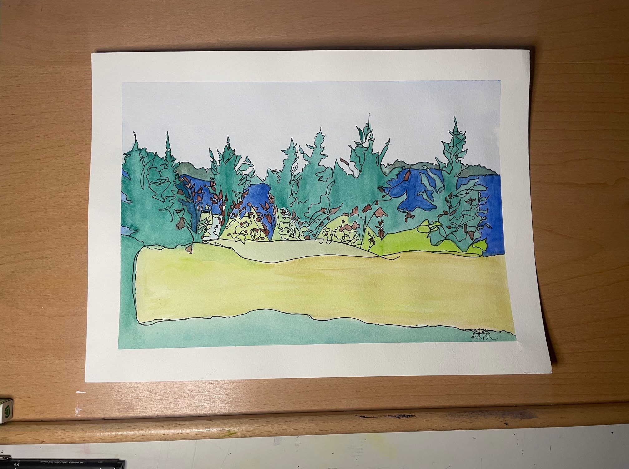 blind contour studies of landscapes turned into colorful blocky watercolors