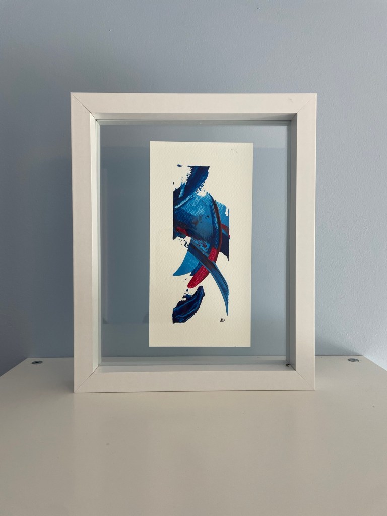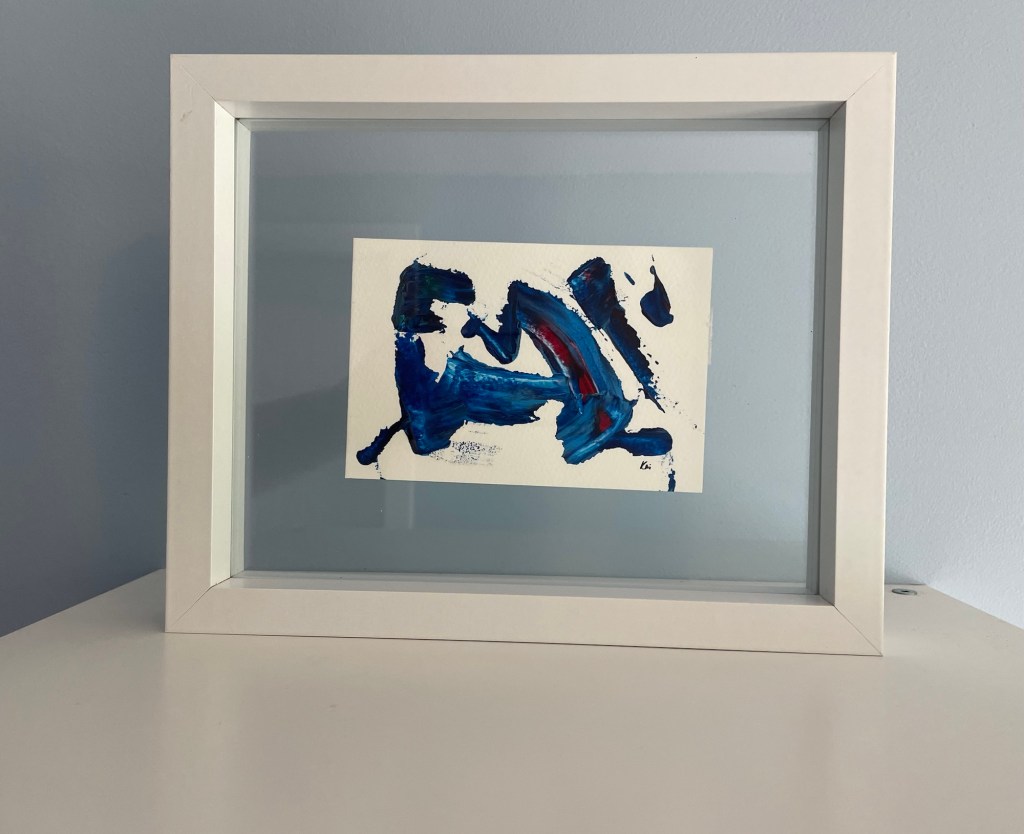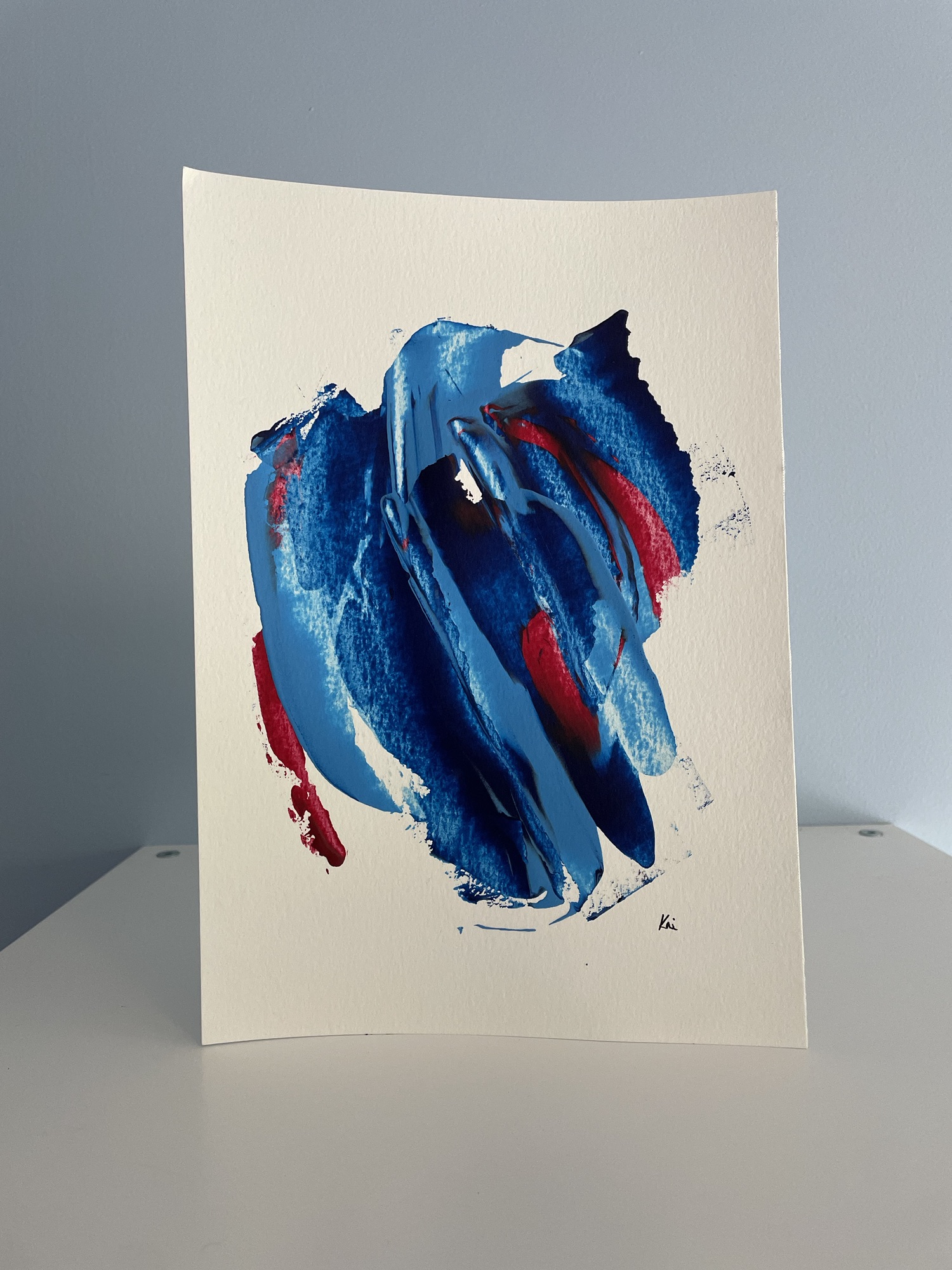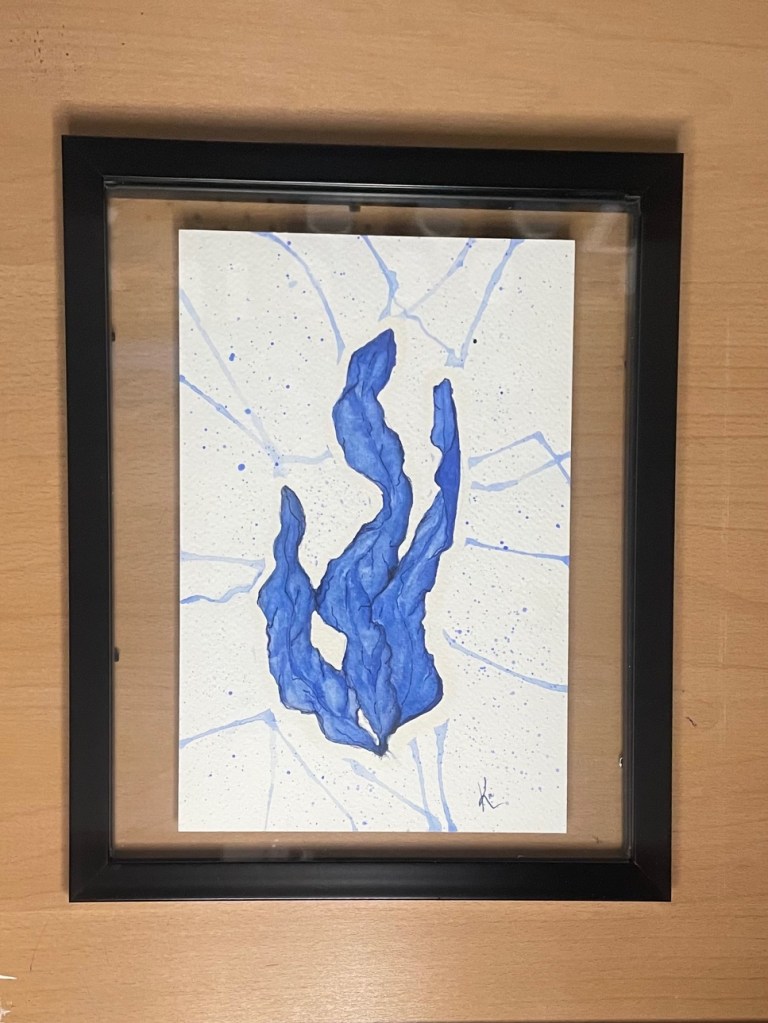 blue seaweed with splatter and light blue lines pulling from edges to almost seaweed. Gifted to self.