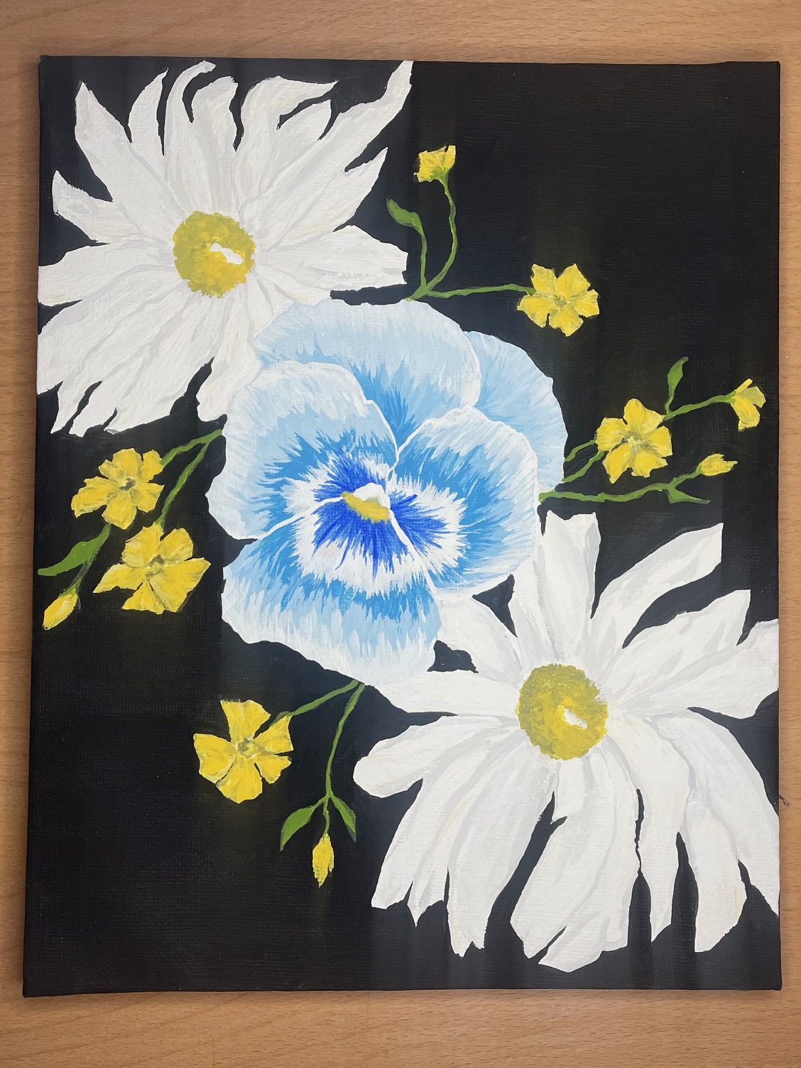 on a black background there is a blue pansy in the middle, with two white daisies with yellow centers, and sprigs of buttercups.