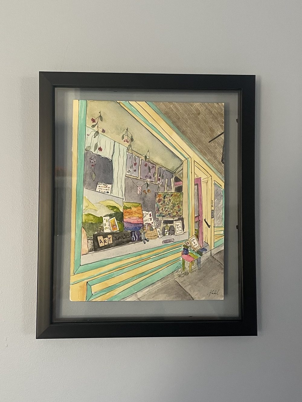 a framed painting of colorful storefront window, with yellow and green siding and multicolored window display Gifted to Whimsy and Wild Things.