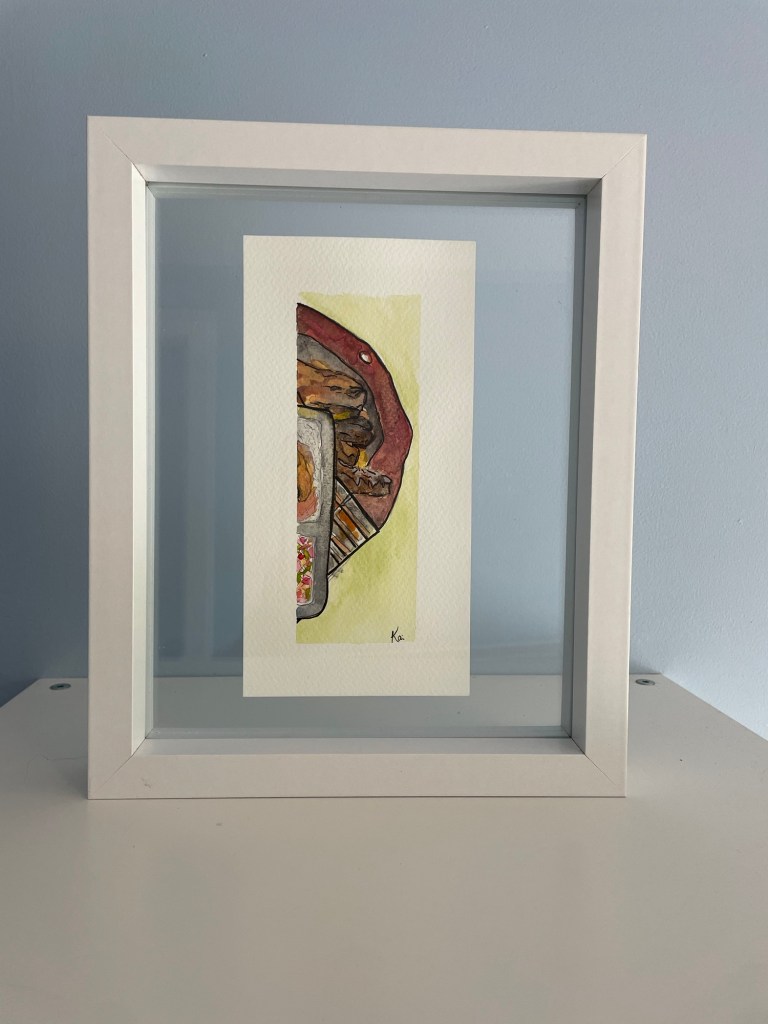 in a white frame a painting with a green background and red firepit, with logs and flame, a grill, and sheet pan is painted. It appears to be an image in half