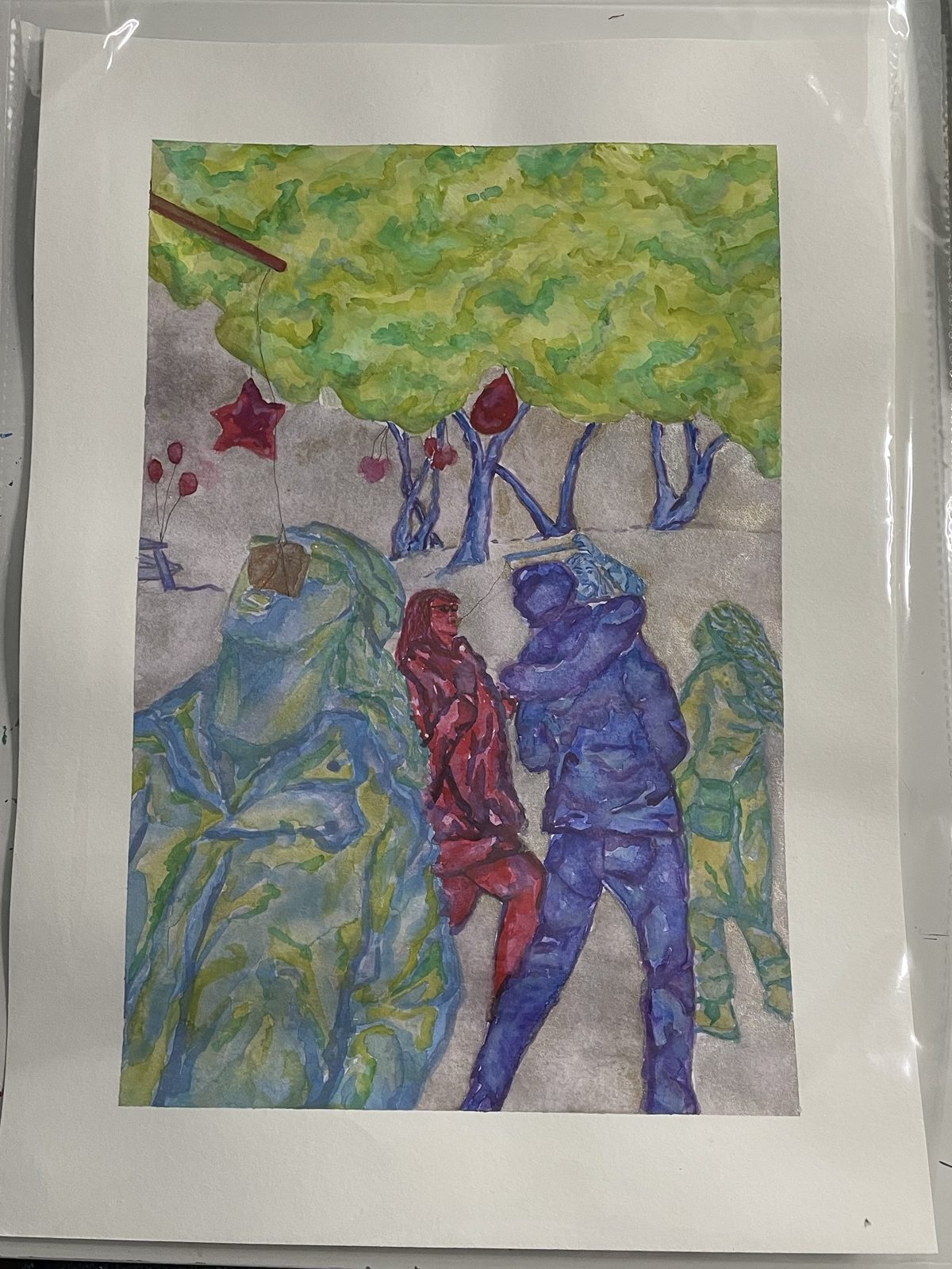 Whimsical watercolor illustration depicting figures standing under vibrant trees with decorative elements.