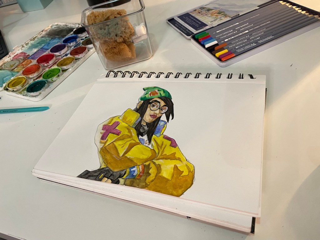 A watercolor character study featuring a KJ, figure in a bright yellow jacket and green cap.
