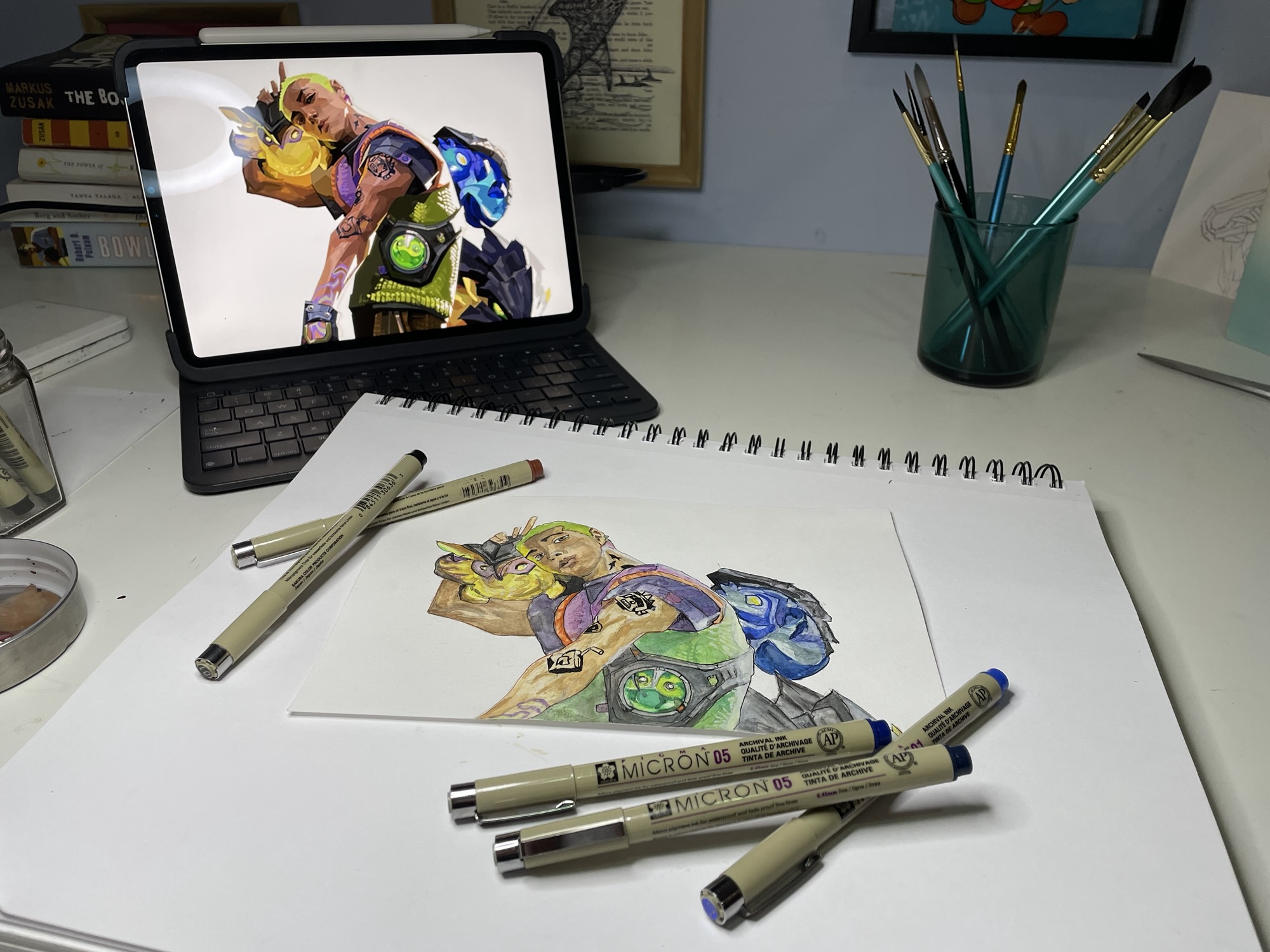 Character study of Gekko from the game Valorant, including his two pets and tattoos.