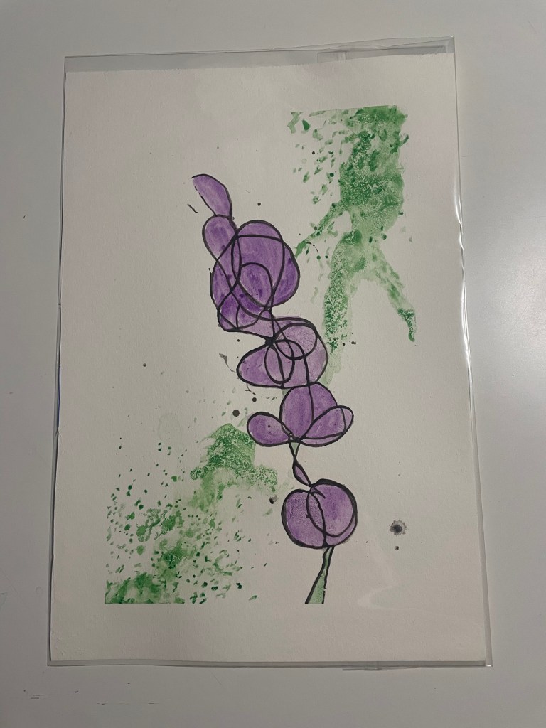 An abstract watercolor piece featuring a whimsical flower design in purple and green.